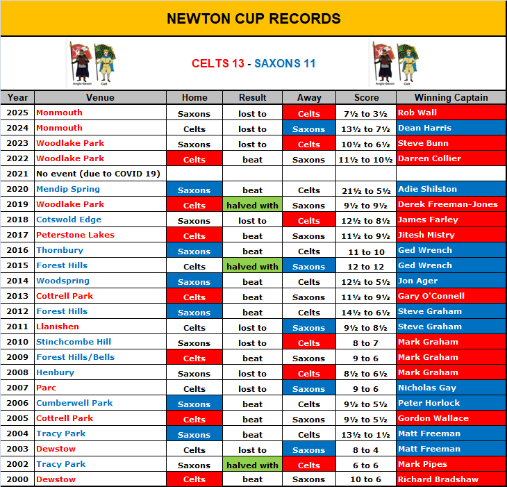 | The Newton Cup started its life as a challenge match in 2000 between Englishmen and Welshmen working together at Hyder Business Services in Cardiff. It soon became apparent that the English side were struggling for numbers so other nationalities joined in to form a Rest of the World side. The event was organised by Paul Newton, who captained the Rest of the World side against the Welsh side captained by Richard Bradshaw. The match was played at Dewstow Golf Club near Caldicot, with Wales coming out winners. The event was resurrected during the 2002 season with the Nomads Society by now having a full calendar of events of which this match was to become its centrepiece. Following the tragic death of its founder in 2003, the challenge match was renamed in his honour and has been played every year since. |